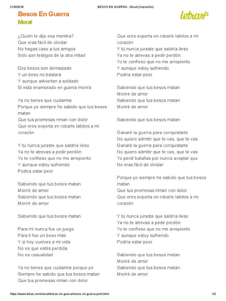 Besos En Guerra Letra - Ya no tienes que cuidarme porque yo siempre he sabido que tus besos matan que tus promesas riman con dolor. Besos En Guerra Letra - Learn vocabulary, terms and more with flashcards, games and other study tools.