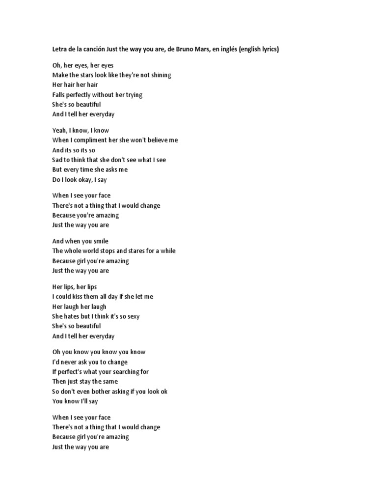 Lyrics To Just The Way You Are By Bruno Mars Just The Way You Are Lyrics - Bb fcause you're amazing, just the way you are.
